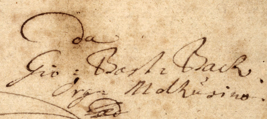 Bachs eigenhändiger Namenszug auf dem Deckblatt der Kantate Gott ist mein König, 1708. Er schreibt sich italienisch als Gio. Bast. Bach (= Giovanni Bastiano Bach)