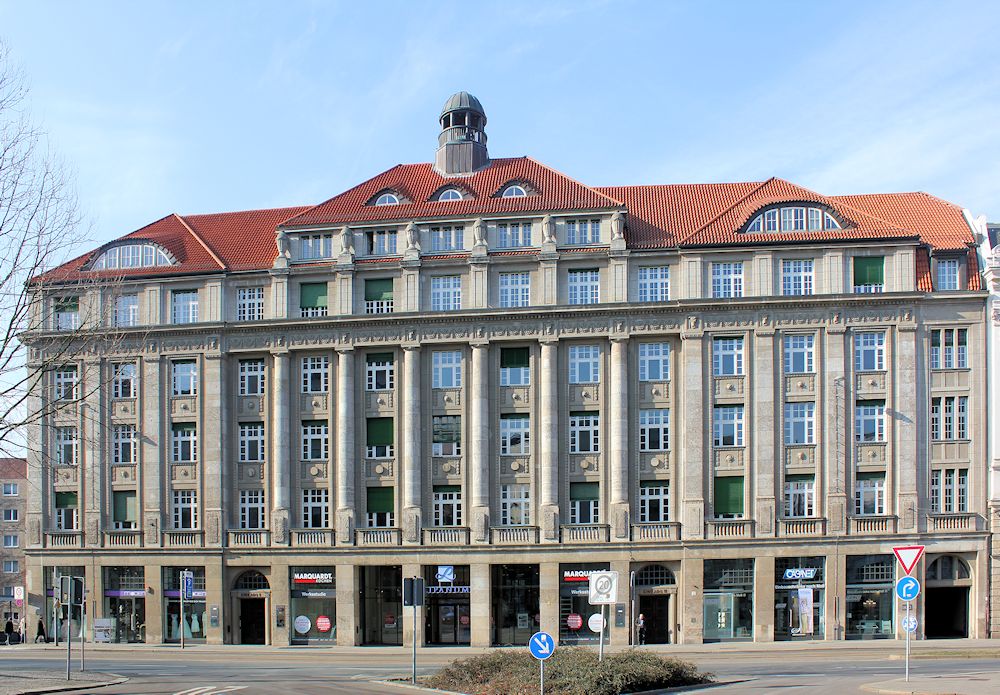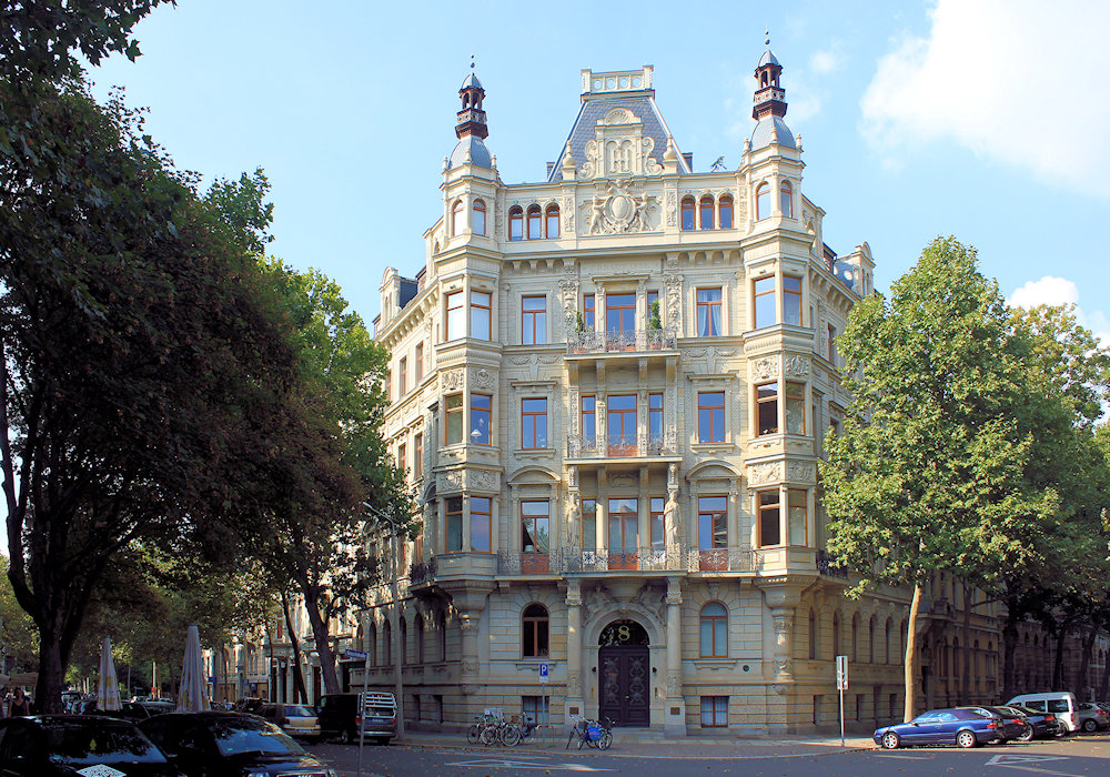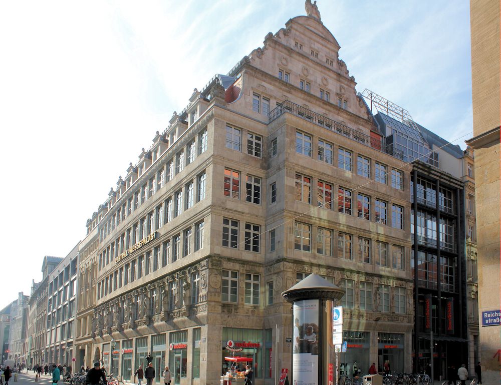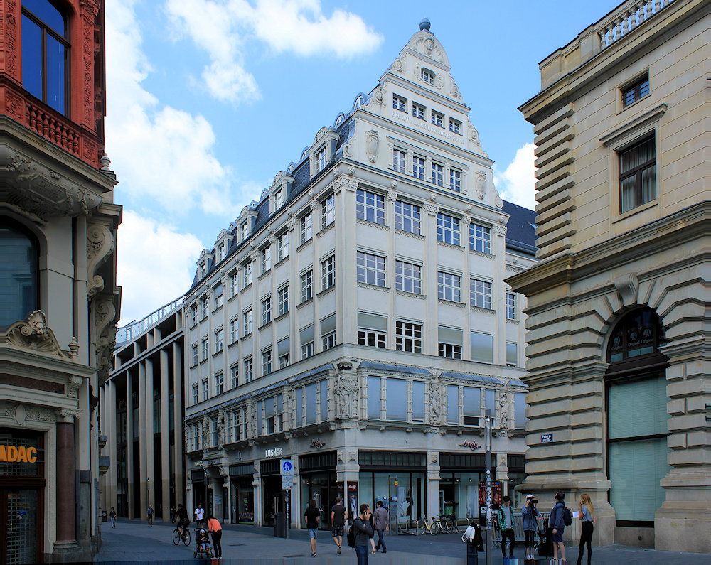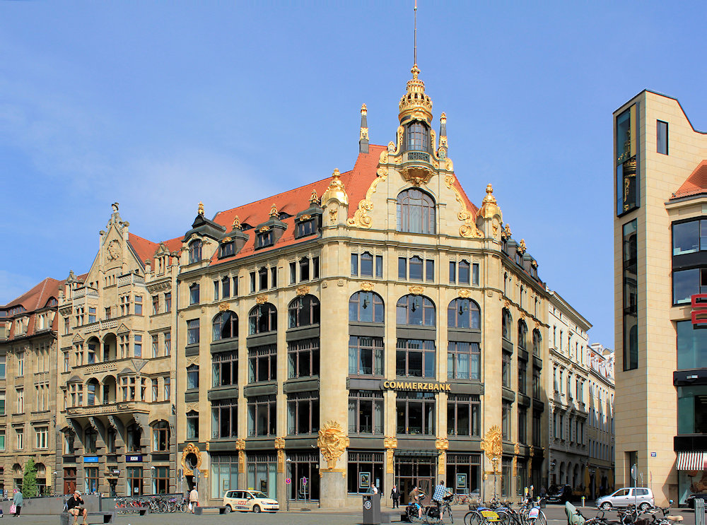 Ab ca. 1890 setzt sich auch der Jugendstil in Deutschland durch. Oft wurden Historismus und Jugendstil vermischt. In Leipzig hatte es der Jugendstil schwer. Die Leipziger Architekten entwickelten eine eigene Formensprache, den gemäßigten Historismus. Betonung der Vertikalen, teils monumentale Fassadengestaltungen mit Säulen und große Fensterflächen prägen die Großbauten in Leipzig ab etwa 1900.