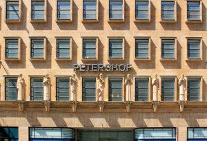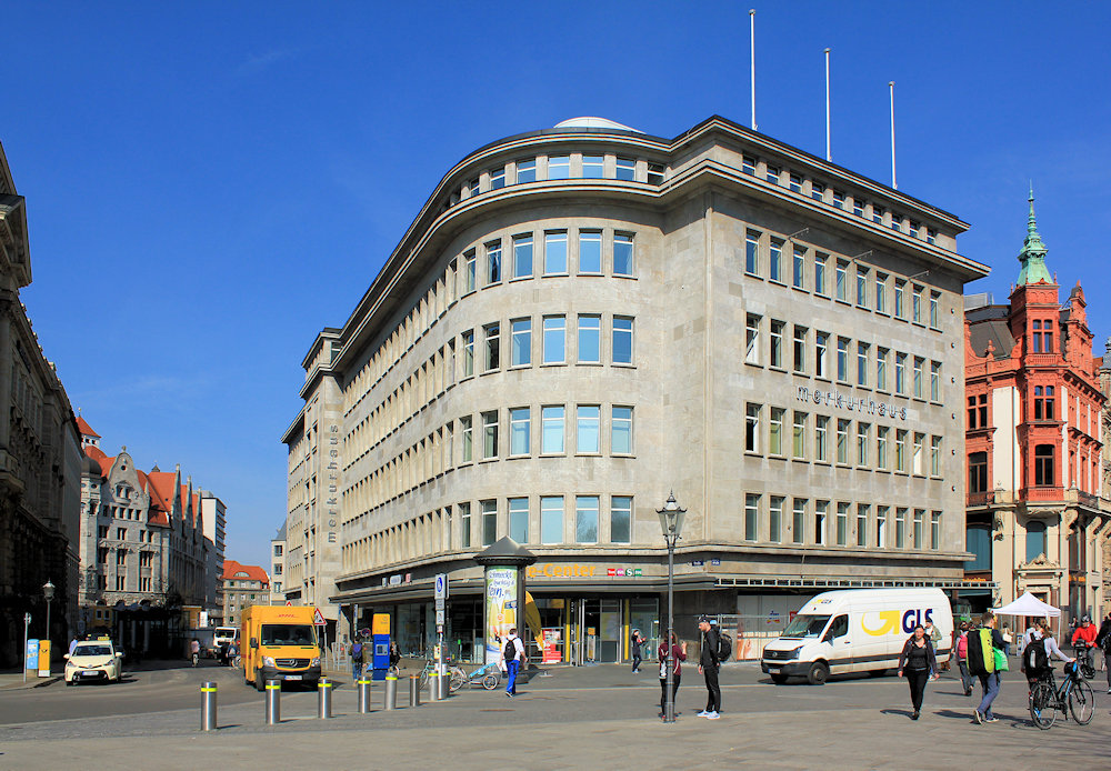 Das Merkurhaus am Ende der Petersstraße wurde 1937 durch Karl Fetzner erbaut. Der wuchtige Bau im Stil der Neuen Sachlichkeit verfolgte das Ziel, Zweckmäßigkeit und Klarheit in der Fassade auszudrücken. Das ehemalige Textilkaufhaus wurde symbolisch unter den Schutz des Handelsgottes Merkur gestellt.