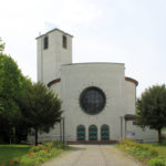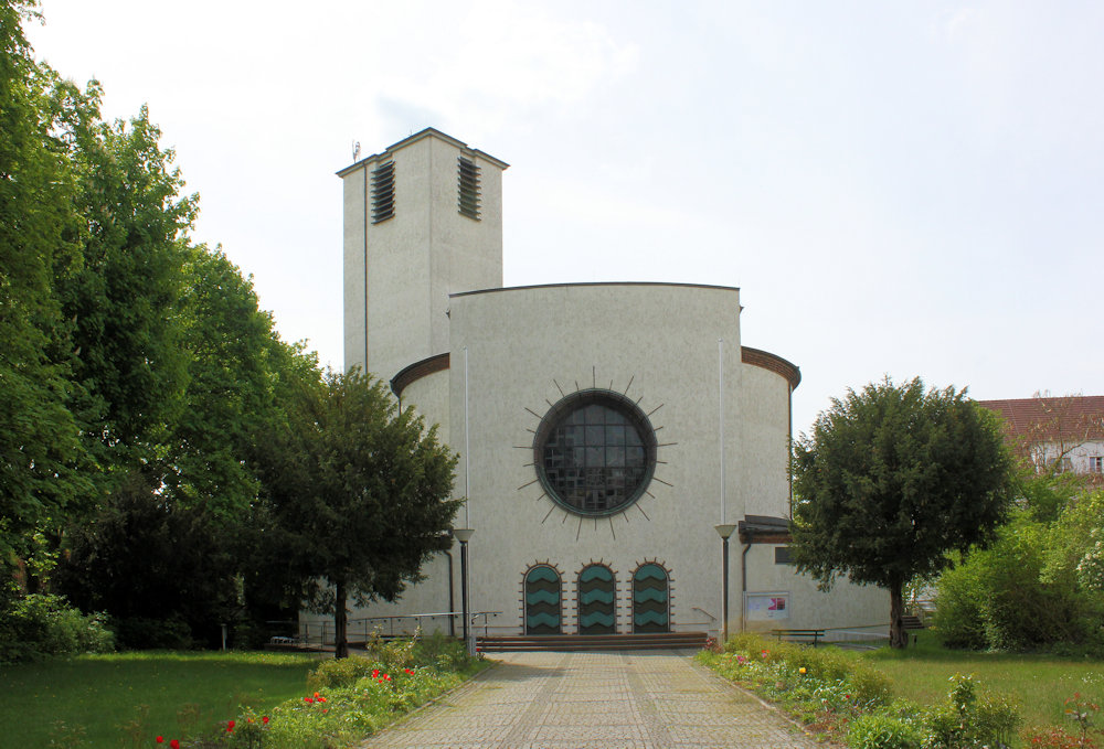 Die Bonifatiuskirche in Connewitz ist Gotteshaus und Denkmal für 1.500 gefallene katholische Kaufleute im 1. Weltkrieg. Theo Burlage schuf einen Rundbau mit rechteckigem Eingang und Turm.