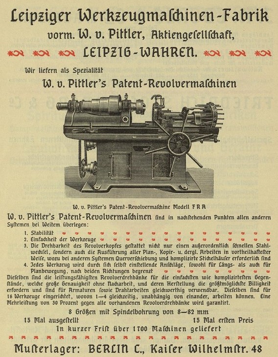 Von Pittler widmete sich Näh- und Stickmaschinen, 1881 konstruierte von Pittler Maschinen, die er 1886 bis 1894 in Gohlis serienmäßig baute. 1887 erfand Julius Wilhelm von Pittler die Doppelstich-Näh-Stick- und Stopfmaschine.1888 konstruierte von Pittler eine Universalmaschine zur Metallbearbeitung mit sechs Anwendungsmöglichkeiten und gründete 1889 die Maschinenfabrik Invention, aus der 1895 die Leipziger Werkzeugmaschinenfabrik AG vorm. W. v. Pittler hervorging. 1890 konstruierte von Pittler die Revolverkopf-Maschine, zunächst mit sechs, seit 1894 mit 16 Werkzeuglöchern und 1894 einen schwingender Doppelsupport zur Herstellung von Fahrradnaben und eine Naben-Drehbank, zudem entwarf er bis 1900 zahlreiche Sondermaschinen.