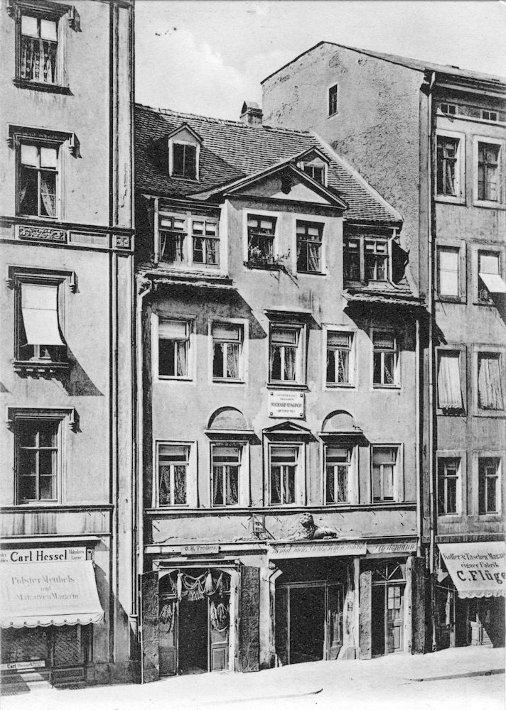 Wilhelm Richard Wagner wurde am 22. Mai 1813 in Leipzig im Gasthof zum roten und weißen Löwen am Brühl als neuntes Kind des Polizeiaktuars Carl Friedrich Wilhelm Wagner und der aus Weißenfels stammenden Bäckerstochter Johanna Rosine Pätz geboren. Am 23. November 1813 starb sein Vater an Typhus, der infolge der Völkerschlacht bei Leipzig in der Stadt grassierte. Wagners Mutter heiratete 1814 den Porträtmaler, Schauspieler und Dichter Ludwig Geyer, ein Freund von Carl Friedrich Wagner.Noch 1814 zog die Familie nach Dresden, wo Richard 1817 unter dem Namen Richard Geyer eingeschult wurde. 1819 erkrankte der Stiefvater Ludwig Geyer, Richard Wagner wurde zu Pastor Wetzel nach Possendorf bei Dresden in Obhut gegeben, wo er Mozarts Lebensgeschichte kennenlernte. Geyer starb am 30. September 1821 in Dresden.