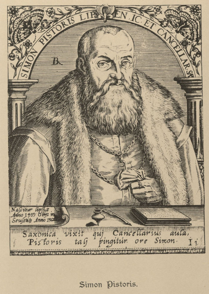 Simon Pistoris d.J., ab 1521 auch Pistoris von Seuselitz oder von Seußlitz genannt, wurde am 28. Oktober 1489 in Leipzig geboren. Er lernte in Leipzig Martin Luther kennen und schätzen.Nach fast dreijährigen Studienaufenthalten an der Universität Pavia promovierte Pistoris 1514 in Leipzig zum Doktor beider Rechte und wurde im selben Jahr zum ordentlichen Professor an der juristischen Fakultät der Universität Leipzig berufen. Pistoris war Kanoniker an den Bischofskirchen in Merseburg und Naumburg sowie Beisitzer am Oberhofgericht in Leipzig.