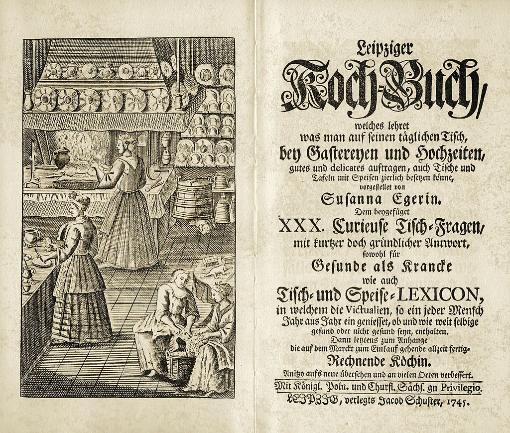 1706 erschien die 1. Auflage des „Leipziger Kochbuches“ von Susanna Eger im Verlag Jacob Schuster in Leipzig. Susann Eger schrieb ihr gesamtes Wissen um die sächsische Küche mit ca. 900 Rezepten auf. In einem ersten Anhang wurden 30 ernährungswissenschaftliche Fragen allgemeinverständlich beantwortet. Der zweite Anhang bestand aus einem Lexikon, in dem zahlreiche Lebensmittel und Gewürze beschrieben wurden. Der anschließende Teil „Die allzeitfertig-Rechnende Köchin“ mit zahl- und hilfreichen Tabellen zum Einmaleins, Umrechnen von Maßen, Gewichten und Münzen war für den täglichen Gebrauch, wie für Einkäufe auf dem Markt gedacht. Im abschließenden Küchen-Inventarium waren die Gerätschaften aufgeführt, die in eine gut geführte Bürgerküche des 18. Jahrhunderts gehören sollten. Kupferstiche ergänzten in späteren Auflagen das Kochbuch der Susanna Eger. Eine bemerkenswerte Innovation und Besonderheit des Kochbuches waren die zahlreichen Mengenangaben in den Rezepturen.