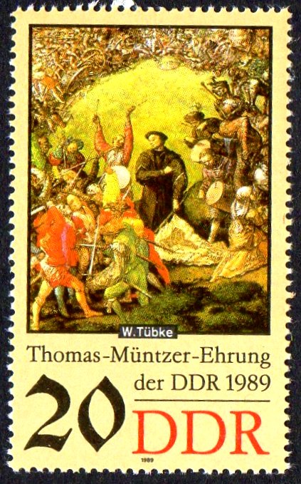 Briefmarke der Deutschen Post der DDR mit einem Ausschnitt aus dem Bauernkriegspanorama von Werner Tübke