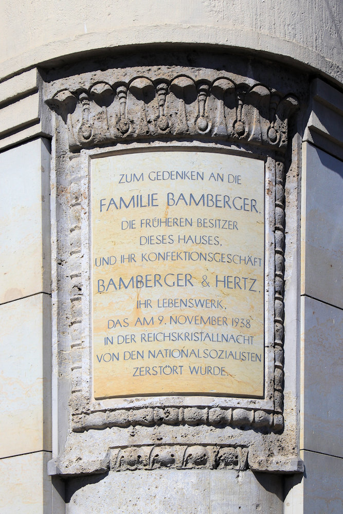 Am Königsbau in der Goethestraße, Ecke Grimmaische Straße in Leipzig erinnert eine Gedenktafel an das Kaufhaus Bamberger & Herz. 1911 wurde das Kaufhaus, das in Besitz jüdischer Familien war, eröffnet. Besitzer war Heinrich Bamberger, die Geschäftsleitung wurde durch die drei Brüder Bamberger geführt.
