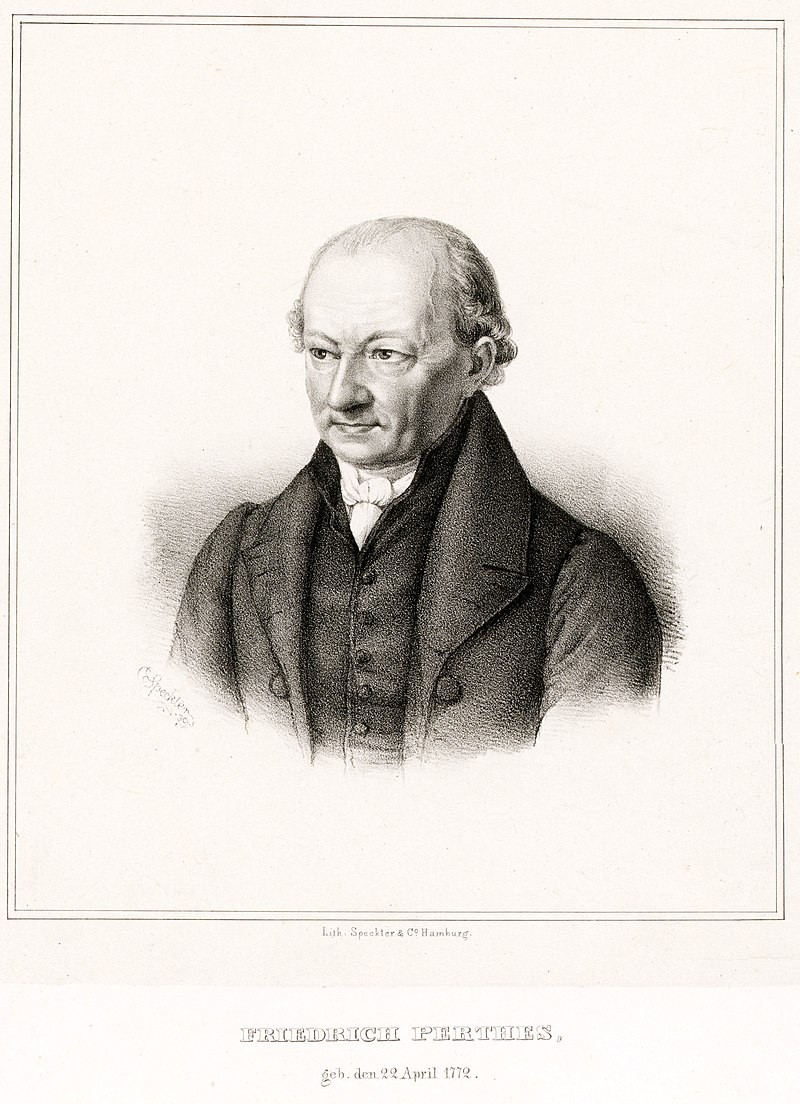 Friedrich Christoph Perthes wurde am 21. April 1772 in Rudolstadt geboren. Friedrich Perthes folgte dem Vorbild seines Onkels, des Gothaer Verlagsbuchhändlers Justus Perthes, und trat 1787 eine Lehre beim Verlagsbuchhändler Adam Friedrich Böhme in Leipzig an. 1793 wurde Perthes Gehilfe in einer Buchhandlung in Hamburg.Perthes machte sich vertraut mit dem aufklärerischen Denken von Immanuel Kant, Johann Gottfried Herder und Friedrich Schiller. Am 11. Juli 1796 gründete Friedrich Christoph Perthes die erste reine Sortimentsbuchhandlung in Hamburg.