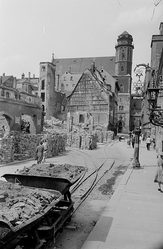 Trümmerfrauen nach dem Kriegsende auf der Schillerstraße vor dem zerstörten Fridericianum der Universität Leipzig