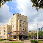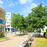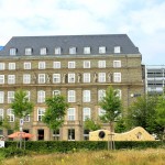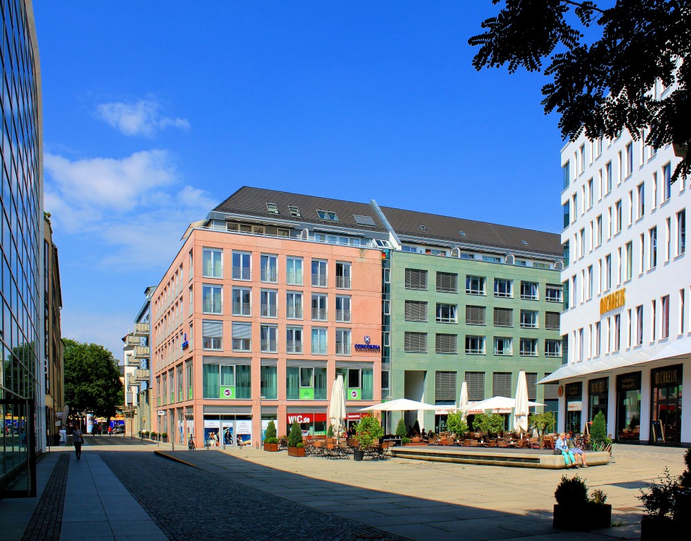 Die Wohnbebauung auf der gegenüberliegenden Straßenseite stammt aus den Jahren bis 1958 und markiert die erste Phase des Wiederaufbaus des Stadtzentrums. Die in der Höhe gestaffelten Gebäude mit Vor- und Rücksprüngen nehmen noch Rücksicht auf den alten Stadtgrundriss und die historische Bebauung.