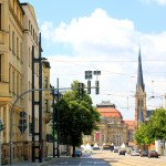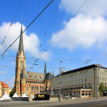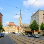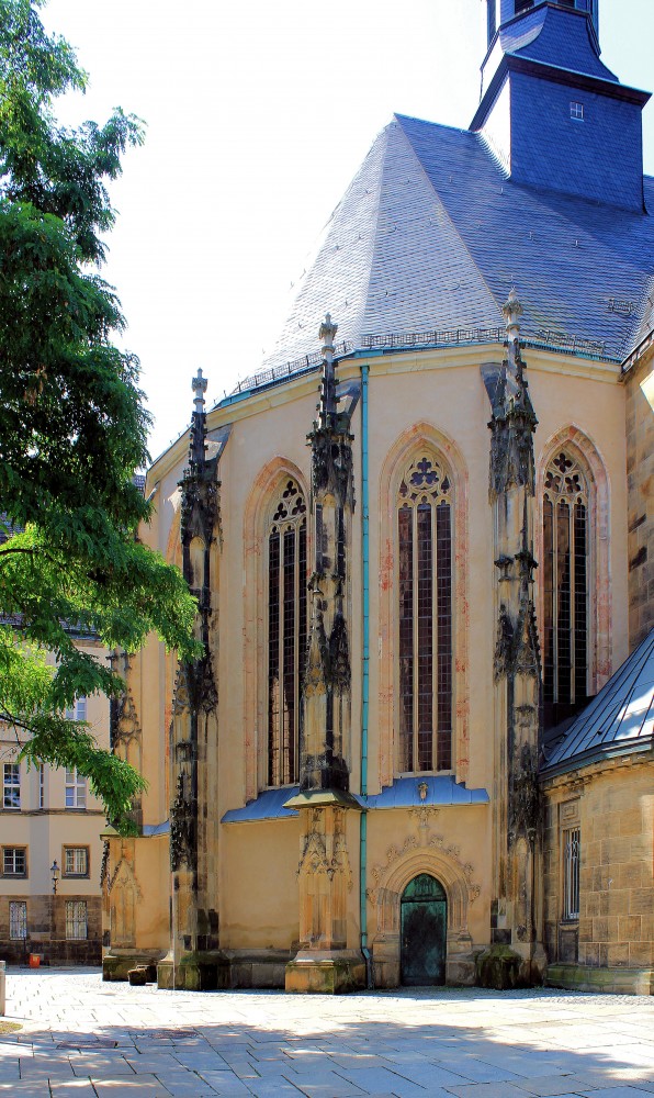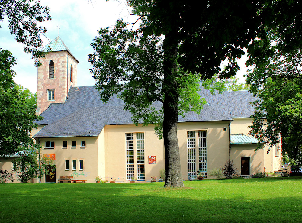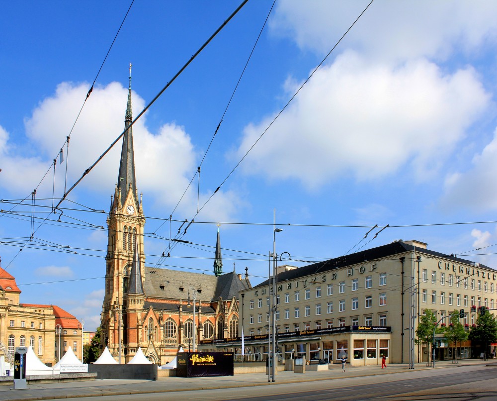 Auf der gegenüberliegenden Straßenseite steht in einer Grünanlage die Ev. Johanniskirche [7]. Die älteste Kirche von Chemnitz wurde 1264 erstmals erwähnt. Ihre heutige Gestalt erhielt sie nach den Zerstörungen des 2. Weltkrieges.