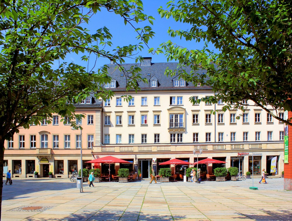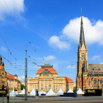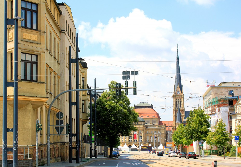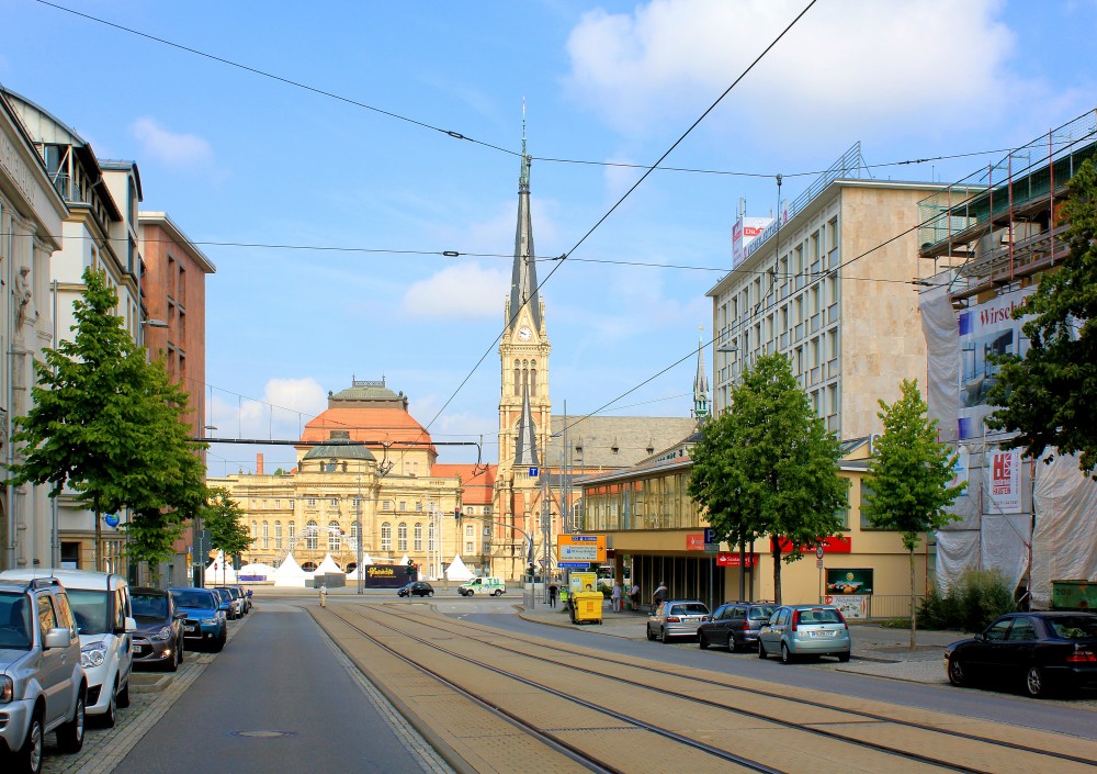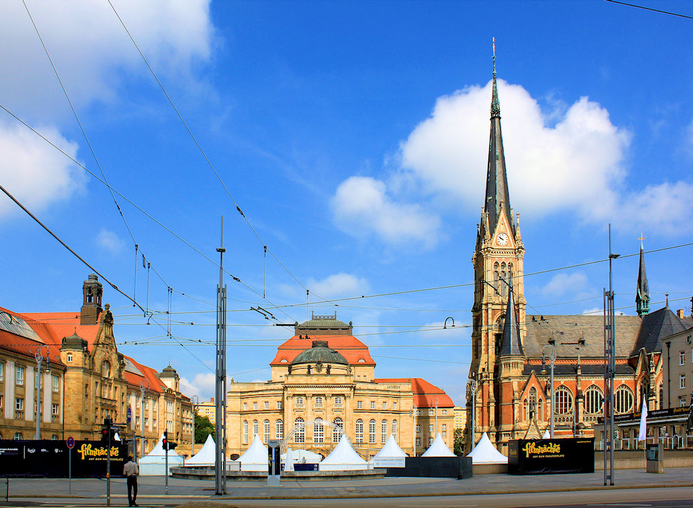 Der Theaterplatz [3] ist der schönste Platz von Chemnitz. Im Wesentlichen geht seine Gestaltung auf Pläne des Architekten Richard Möbius aus dem Jahr 1902 zurück. Bereits 1885 wurde die Ev. Petrikirche erbaut, 1906-1909 folgen das Stadttheater und das König-Albert-Museum.