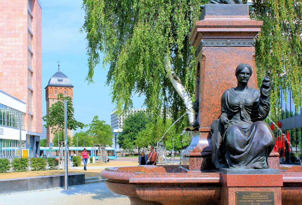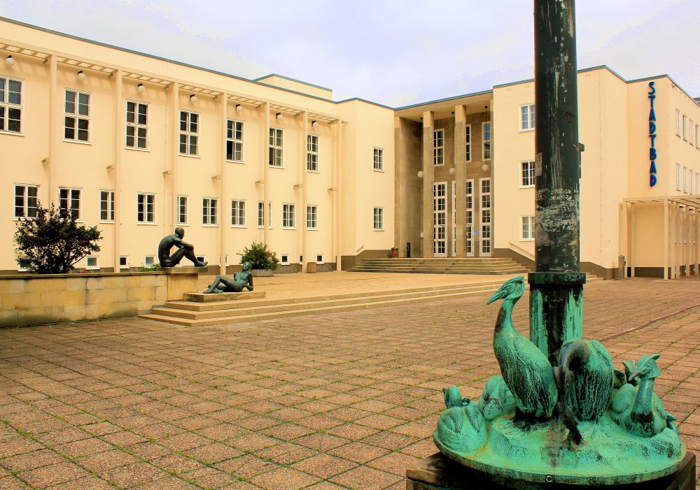 Zwischen Theater und Museum hindurch führt der Rundgang durch Chemnitz zur Mühlenstraße, vorbei an dem wiederaufgebauten Geburtshaus des Chemnitzer Arbeitersohns Fritz Heckert. Auf der gegenüberliegenden Straßenseite steht das Stadtbad [4], das zwischen 1928-1935 erbaut wurde.
