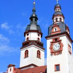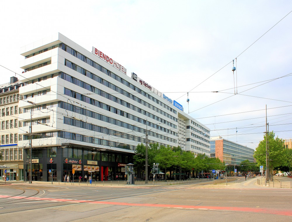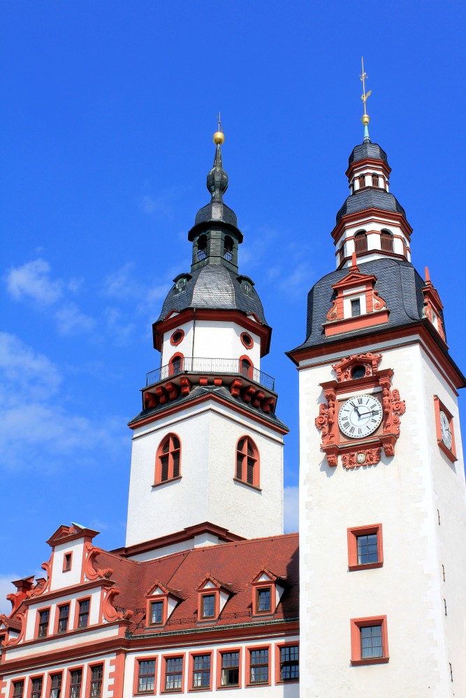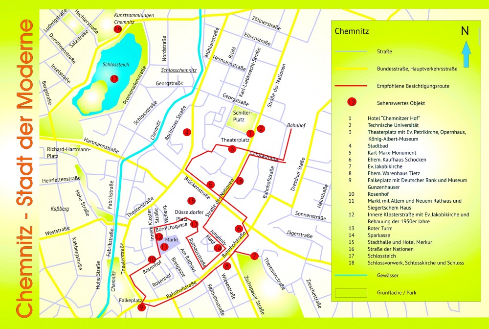 Der Rundgang durch das Zentrum von Chemnitz beginnt am Bahnhof und führt durch die Carolastraße. Die Straße ist weitgehend erhalten geblieben, sehenswert sind das neogotische Eckgebäude an der Bahnhofstraße und das Medienhaus. Weiter gelangt man zum Theaterplatz. Rechts steht das Hotel Chemnitzer Hof [1]. Das 1930 von Heinrich Straumer errichtete Gebäude wurde betont sachlich gehalten. Unweit des Chemnitzer Hofes in der Straße der Nationen steht das Hauptgebäude der Technischen Universität [2], 1874-1878 in Stil der Neorenaissancee erbaut.