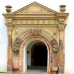 - symmetrisch angelegte Risalite mit ornamentbestückten Dreiecksgiebeln bekrönt,