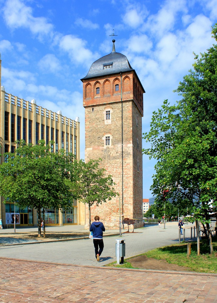 Durch die Börnichsgasse gelangt man zum Düsseldorfer Platz und zum Roten Turm [13]. Grabungen datieren die Fundamente des Turms in das 12. Jahrhundert. Damit ist er das älteste erhaltene Gebäude der Stadt. Der ursprünglich zu einem befestigten Hof gehörende Rote Turm wurde später in die Stadtbefestigung einbezogen. Der Rote Turm ist das letzte erhaltene Zeugnis der Chemnitzer Stadtbefestigung. Am Johannisplatz und in der Wallstraße wurde der Verlauf der Stadtmauer durch Baumpflanzungen nachempfunden.