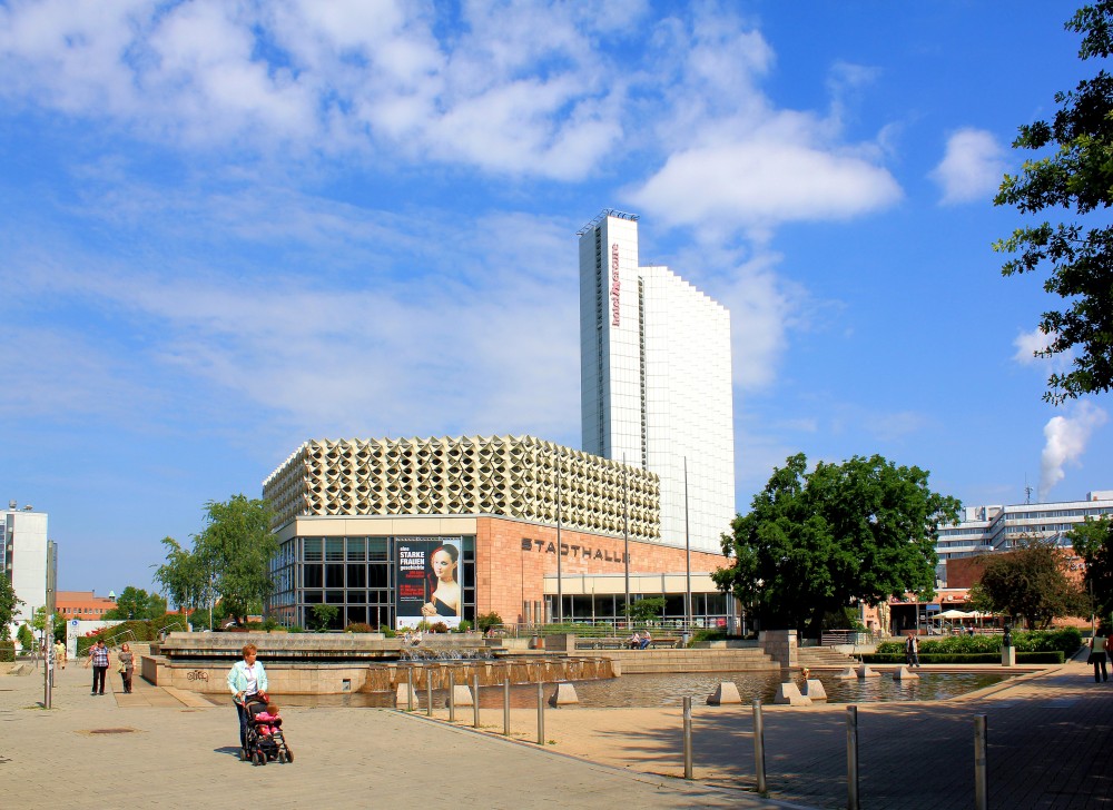 In einem kleinen Park an der Straße der Nationen steht das Gebäudeensemble aus Stadthalle und ehemaligem Interhotel [15] (heute Hotel Merkur). Der 1968 bis 1974 errichtete Gebäudekomplex markiert die neue Mitte von Chemnitz. Der Komplex aus polygonaler Stadthalle und knapp 100 m hohem Hotel galt in den 1970er Jahren als über die DDR hinaus anerkannte Lösung.