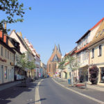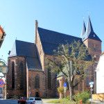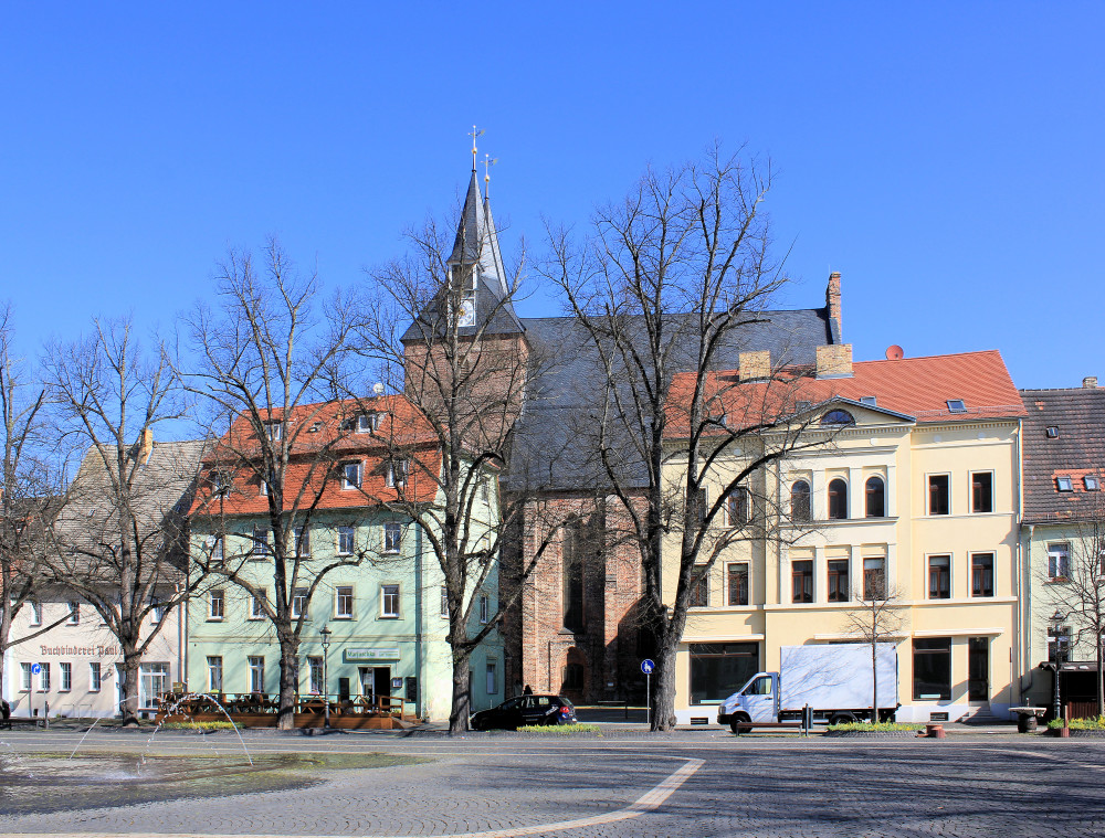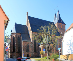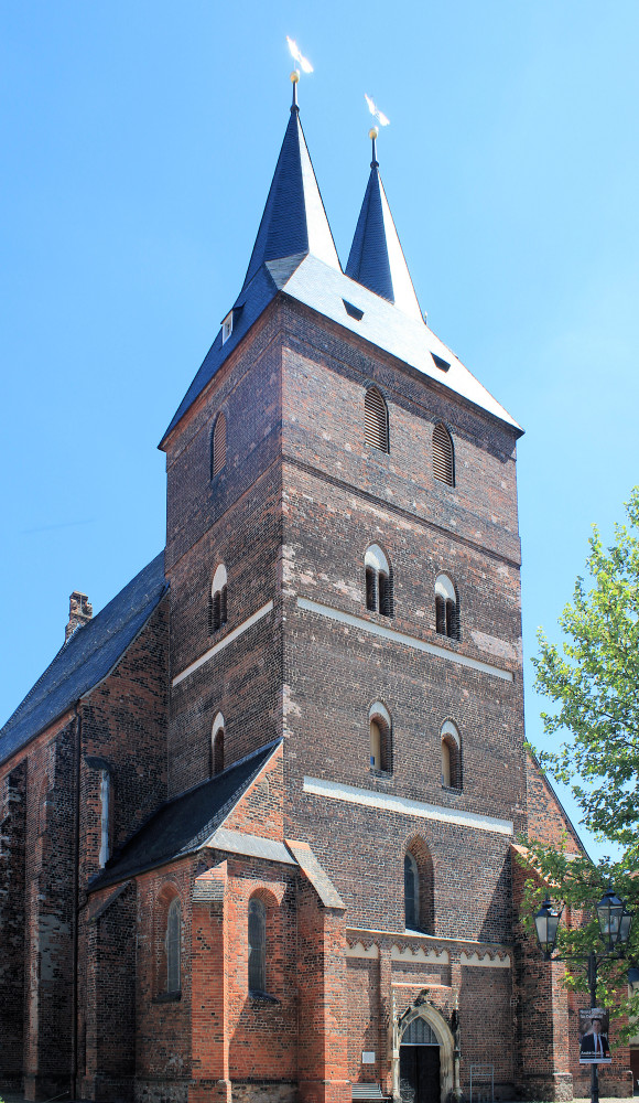 Über die Dächer der nördlichen Markplatzseite ragt die Ev. Stadtkirche St. Peter und Paul [8]. Mit dem Bau der dreischiffigen Hallenkirche wurde im 13. Jahrhundert begonnen. 1437 wurde sie geweiht, 1491 vollendet. Der wuchtige Backsteinbau hat einen Chor mit 5/8-Schluss, Strebepfeiler, Maßwerkfenster und einen Ostgiebel mit Blendbögen.