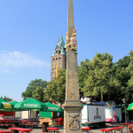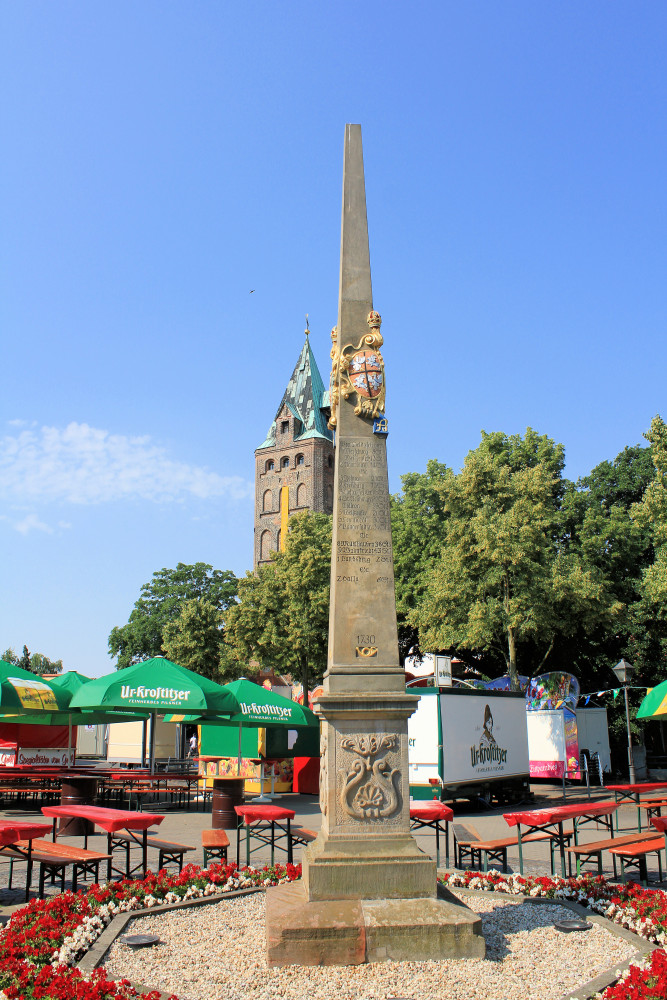 Vor dem Breiten Turm steht auf dem Roßplatz die Kopie einer Kursächsischen Postmeilensäule [10].
