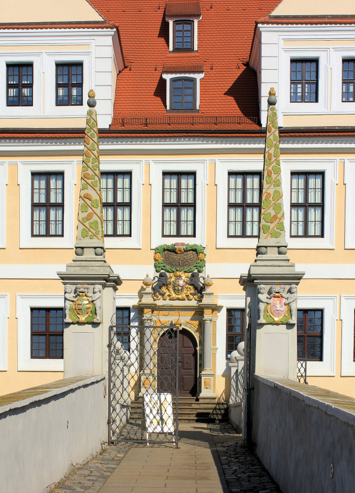 - trockener Wassergraben mit Brücke und zwei Sandsteinobelisken,