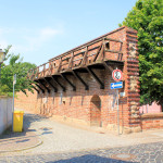 Durch die Schlossstraße führt der Rundgang zur Halleschen Straße zum Halleschen Turm [3]. Der Hallesche Turm war der westliche Zugang zur mittelalterlichen Stadt und wurde zwischen 1394 und 1396 erbaut. Das Kreuzdach stammt aus dem 16. Jahrhundert. Der Hallesche Turm beherbergt heute Ausstellungräume des Delitzscher Kunstvereins.