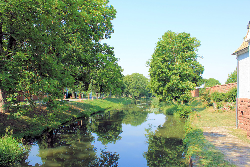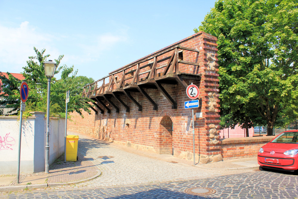 Die Straße Am Wallgraben führt entlang der Stadtmauer [5] zur Leipziger Straße. Die Stadtbefestigung um Delitzsch wurde seit dem 14. Jahrhundert errichtet. Die beiden Stadttore, Breites Tor und Hallesches Tor wurden abgebrochen, erhalten bleiben die Hauptwachtürme (Hallescher Turm und Breiter Turm), der größte Teil des Mauerrings sowie mehrere kleine Türme. Auf dem 1735 eingeebneten Wal entstand eine Promenade, die um die Innenstadt von Delitzsch führt.