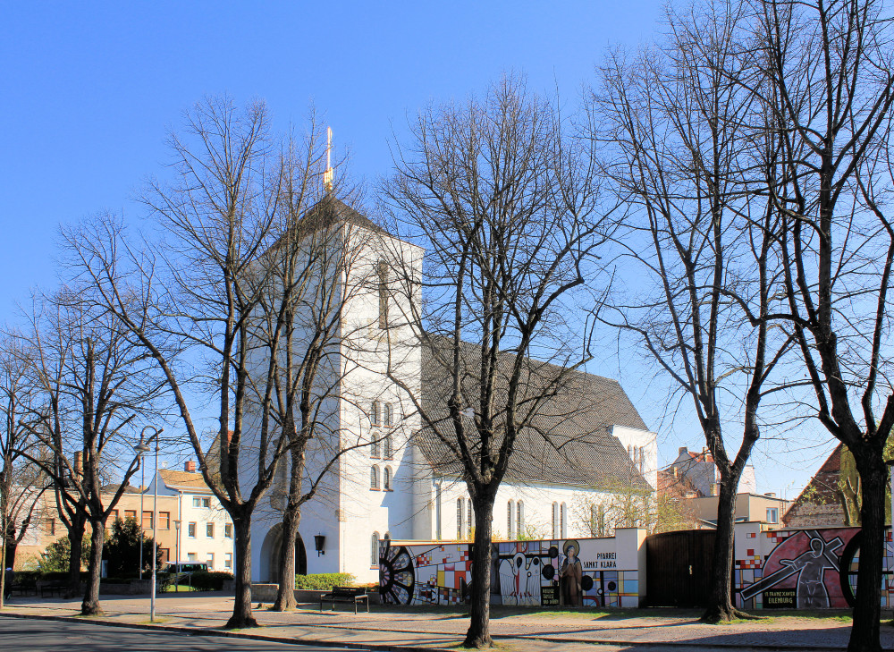 Gegenüber steht die Katholische Marienkirche [12], ein moderner Bau aus dem Jahr 1936 mit wuchtigem Querturm.