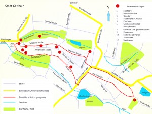 Die Nummern in den eckigen Klammern finden Sie auf der Skizze des Rundgangs durch Geithain.Geithain konnte sein historisches Stadtbild bewahren und präsentiert sich heute mit einer geschlossenen, homogenen Bebauung. Das Stadtbild wird beherrscht von der Doppelturmfassade der Stadtkirche am westlichen Rand der Altstadt und dem Turm der Marienkirche am östlichen Rand im Ortsteil Wickersdorf.