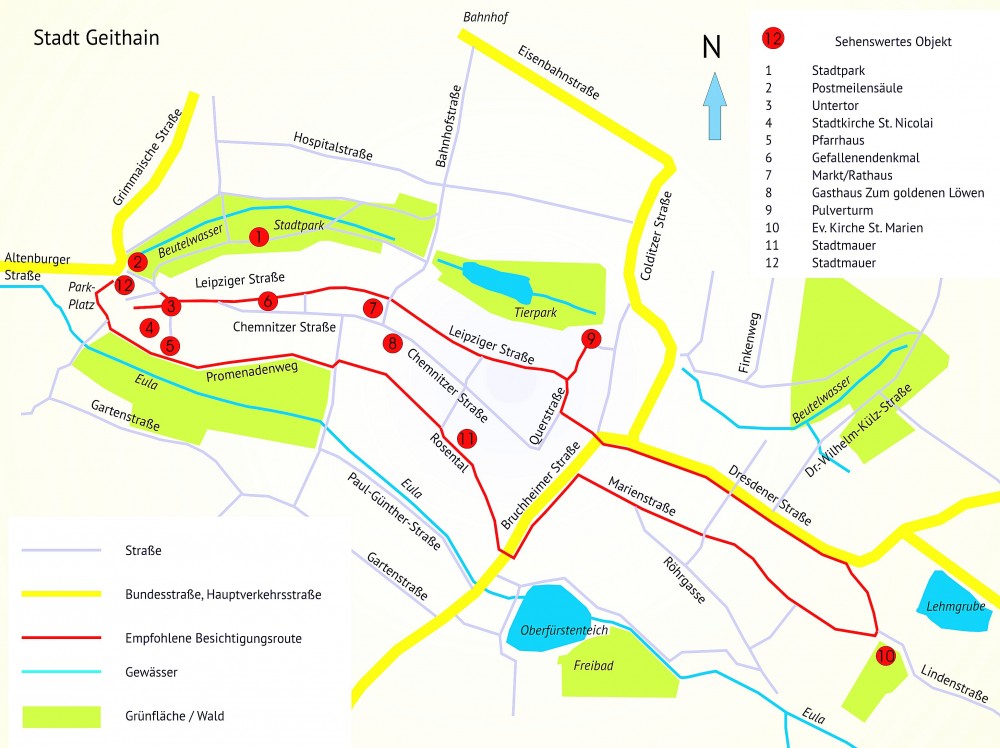 Den Rundgang durch Geithain beginnt man am besten am Untertor. Bahnreisende gehen vom Bahnhof durch die Bahnhofstraße in Richtung Altstadt, durchlaufen den Stadtpark [1] zur Postmeilensäule [2]. Autofahrer können den Parkplatz an der Altenburger Straße nutzen, in unmittelbarer Nähe des Untertors.Das Untertor [3] ist das letzte erhaltene von einst vier Stadttoren Geithains. Es wurde nach 1200 erbaut und liegt am westlichen Rand der Altstadt nahe der St. Nicolaikirche.