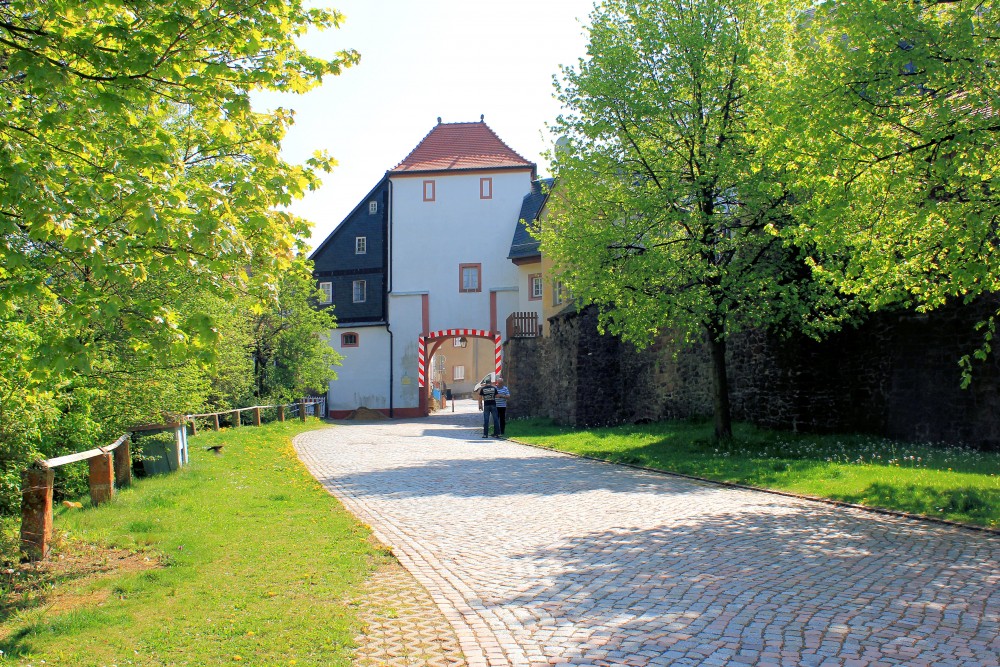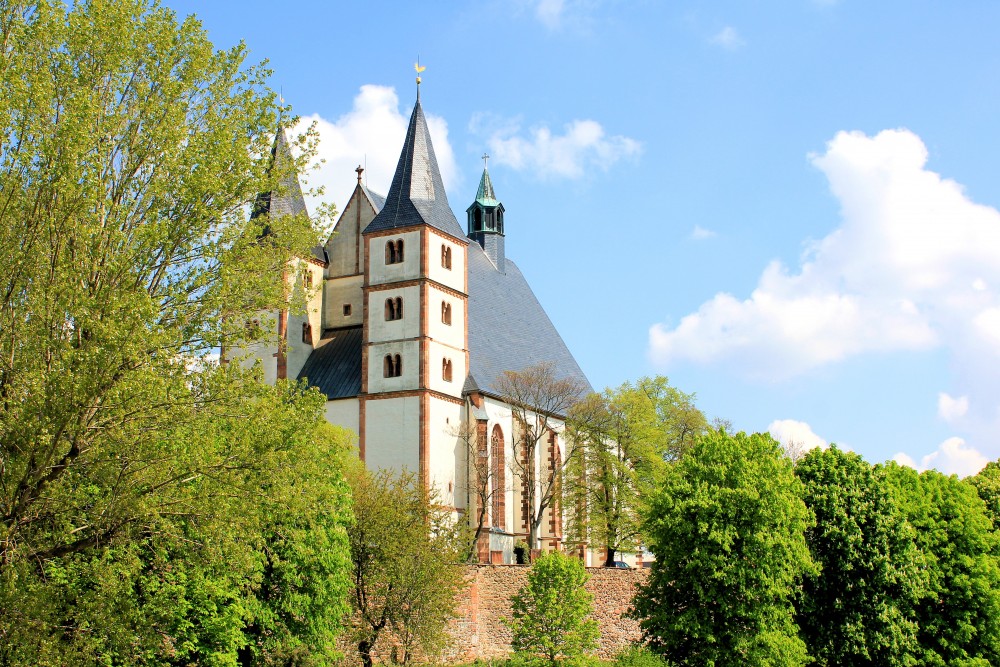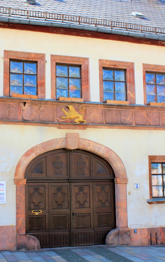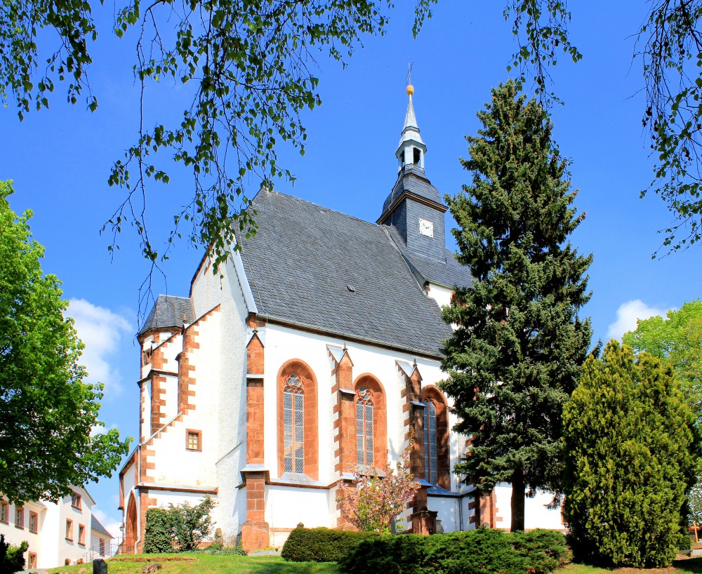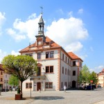 Die Ev. St. Nicolaikirche [4] erhebt sich am westlichen Rand der Altstadt. Sie entstand auf einem Bergsporn auf dem Standort einer mittelalterlichen Burg. Die dreischiffige Hallenkirche mit ihrer Doppelturmfassade wurde als romanischer Bau begonnen. Im 14. Jahrhundert erfolgte der Bau des Chores. 1504 wurde mit dem Bau des Langhauses begonnen. Anstelle des geplanten Gewölbes wurde 1594-1595 eine bemalte flache Decke eingebaut. Von der reichen Ausstattung der Kirche sind der Altar und die Kanzel besonders erwähnenswert. Auf dem ehemaligen Friedhof stehen mehrere Grabsteine aus dem 17. und 18. Jahrhundert. Im Pfarrhaus [5] aus dem 16. Jahrhundert neben der Kirche befindet sich die sogenannte Kalandsstube. Der sternengewölbte Raum besitzt Wandmalereien aus dem 16. Jahrhundert.Durch die Leipziger Straße gelangt man vorbei am Gefallenendenkmal [6] zum Markt mit dem Rathaus [7]. Der Bau aus dem 15. Jahrhundert wurde 1538 in seiner heutigen Form umgebaut. Um 1900 erfolgte ein erneuter Umbau. Die Marktseite wurde als Schauseite repräsentativ mit Balkon und Uhrturm gestaltet.