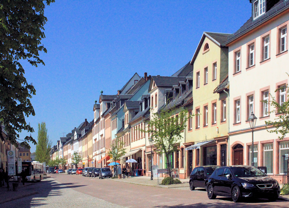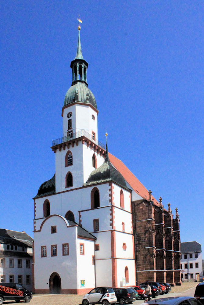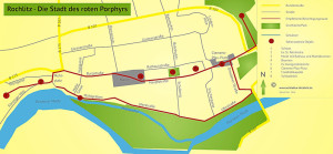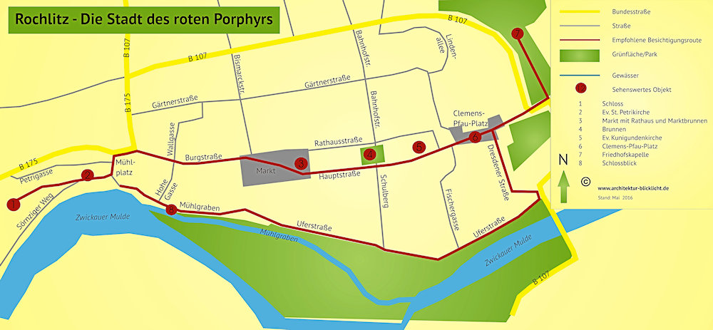 Unterhalb des Oberschlosses befinden sich die Reste des 1645 zerstörten und im 18. Jahrhundert abgebrochenen Unterschlosses. Verlässt man das Schloss nach Osten, gelangt man zur Petrikirche [2]. Die 1168 erstmals genannt Kirche war die Burgkirche und bis zur Reformation Hauptpfarrkirche der Stadt. Seit 1470 wurde die Petrikirche zur gotischen Hallenkirche umgebaut.Durch die Burgstraße gelangt man zum Markt von Rochlitz [3]. Der einst die gesamte Länge der mittelalterlichen Stadt einnehmende Platz wurde erst durch den Bau des Rathauses und des dahinterliegenden Häuserblocks in den Ober- und Untermarkt geteilt. Die Bebauung des Marktes in Rochlitz wird überwiegend durch klassizistische Fassaden geprägt, die nach den Stadtbränden 1802 und 1804 entstanden, wobei einige Häuser im Kern älter sind.