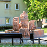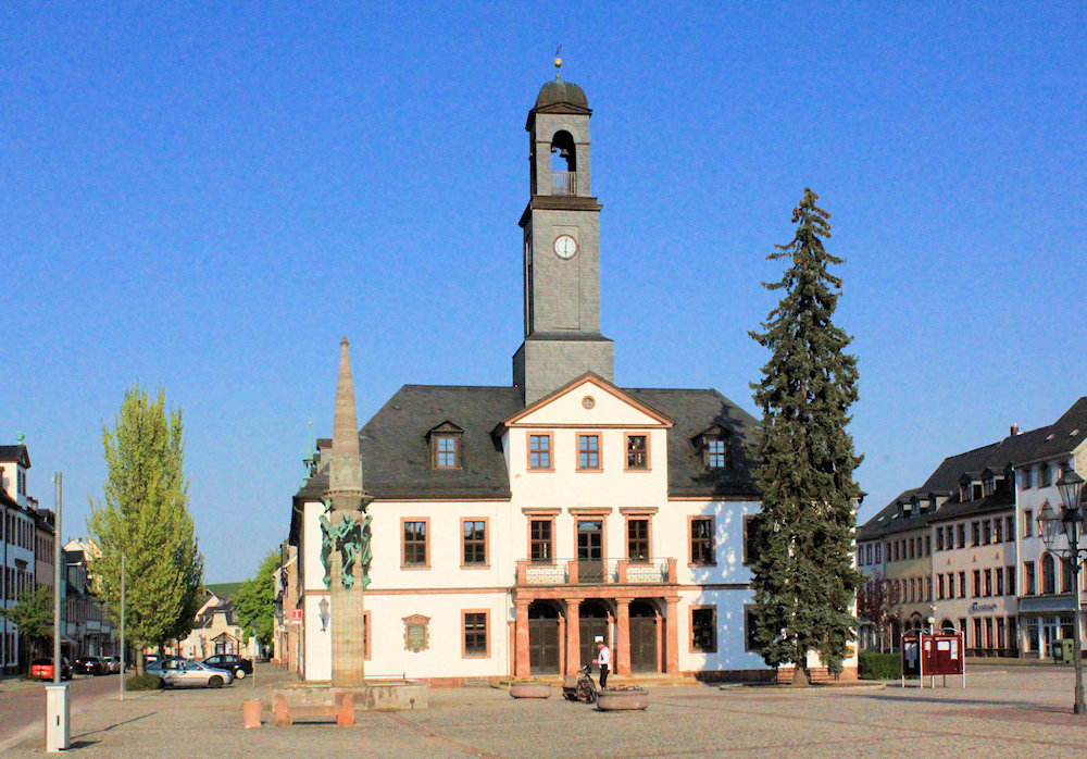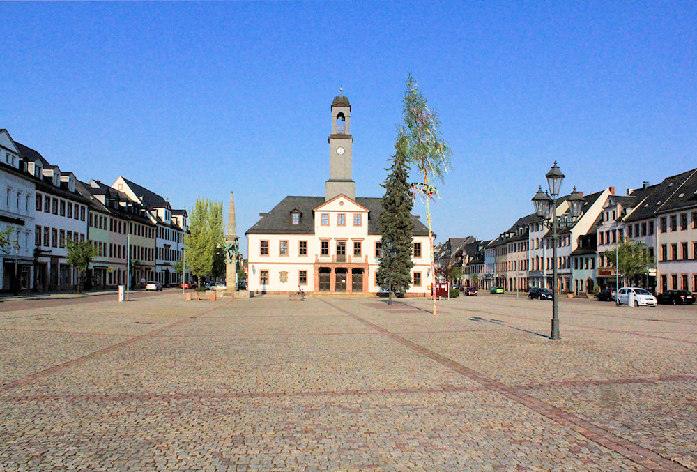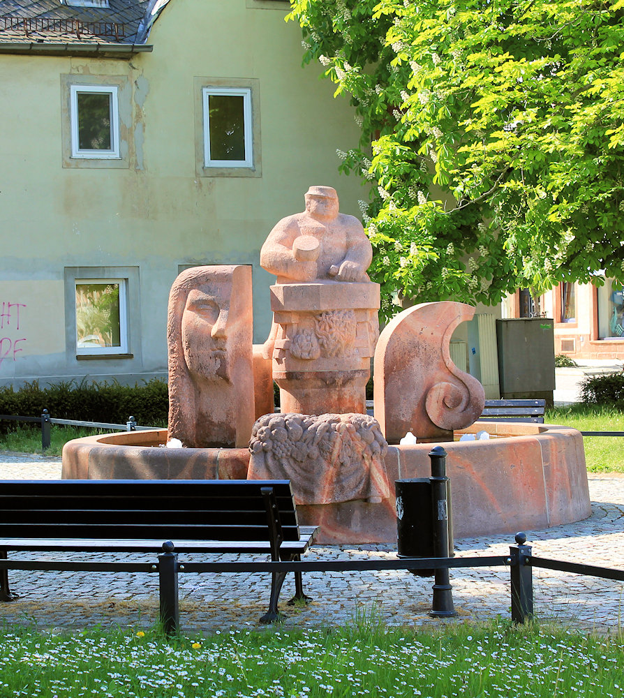 Auf dem kleinen, begrünten Töpfermarkt steht ein Brunnen [4], der an die Steinbruch- und Steinmetztradition in Rochlitz erinnert.