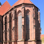 - Querhaus: Putzbau mit Porphyrgliederung, Spitzbogenportale,