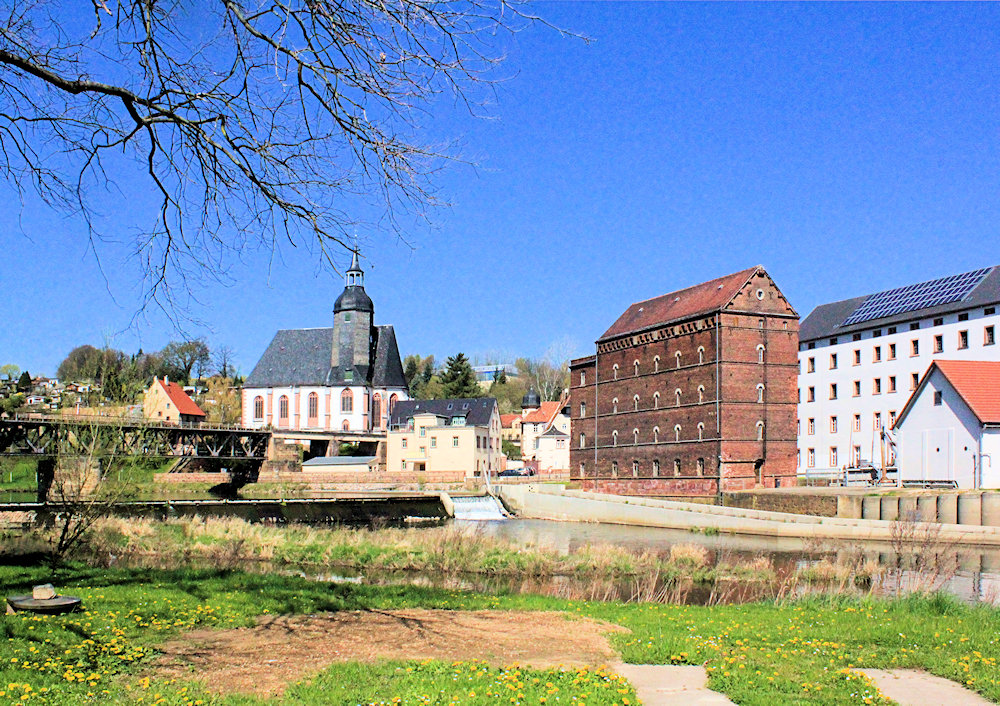 Vom Friedhof kann man zur Muldebrücke gehen und durch die Uferstraße und den Mühlgraben, mit einem schönen Blick auf das Schloss [8], zurück zum Mühlplatz.
