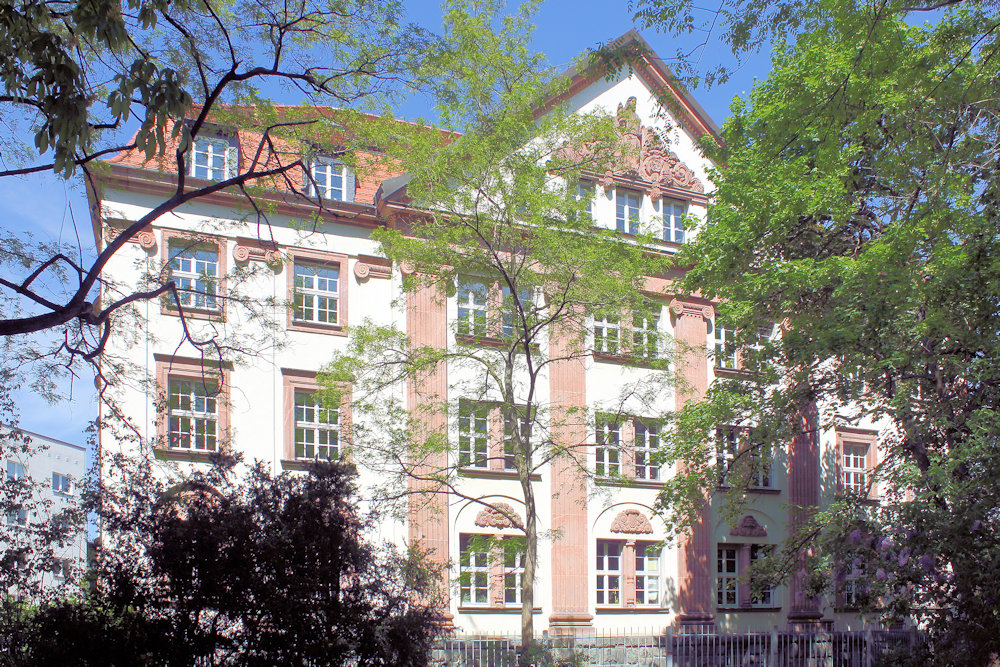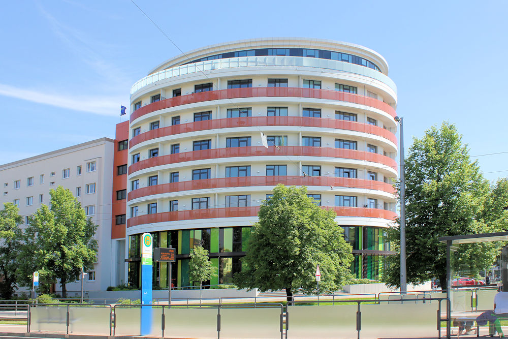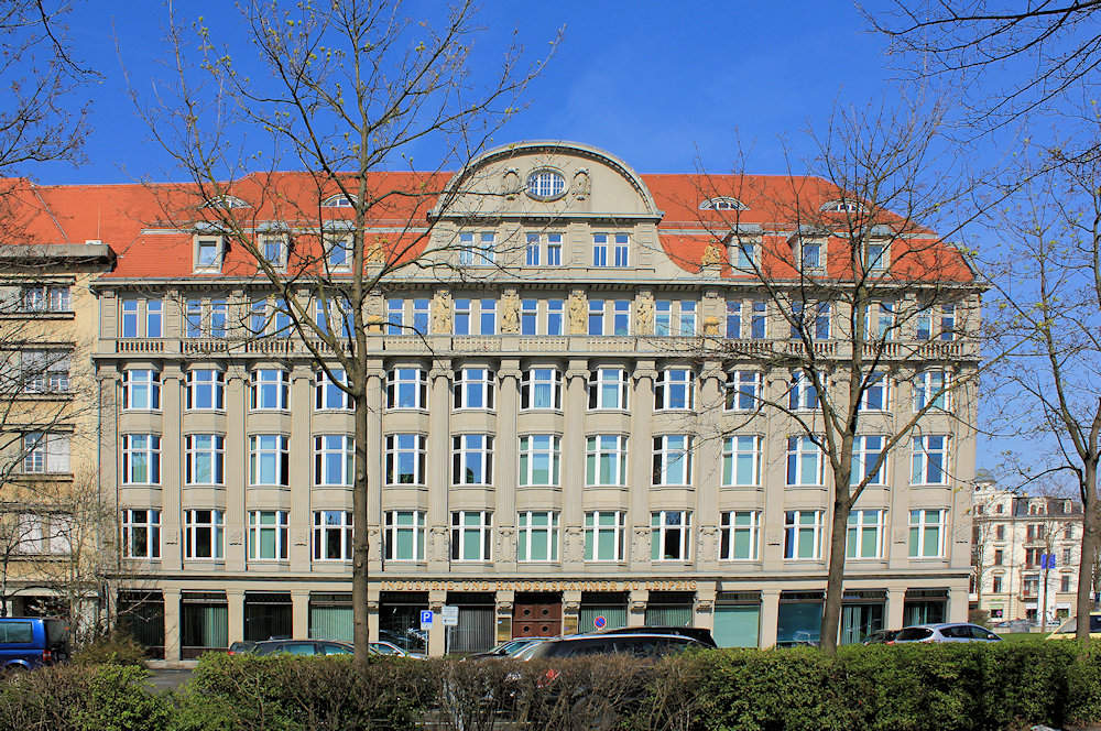Durch den Johannapark erreicht man wieder die Friedrich-Ebert-Straße. Auf der linken Seite steht am Rande des Johannaparks das Gesundheitsamt der Stadt Leipzig [12]. Das 1925 errichtete Verwaltungsgebäude der Berufsgenossenschaft der Textilindustrie zeigt eine Putzfassade mit reicher Porphyrtuffgliederung im Stil des Neoklassizismus.