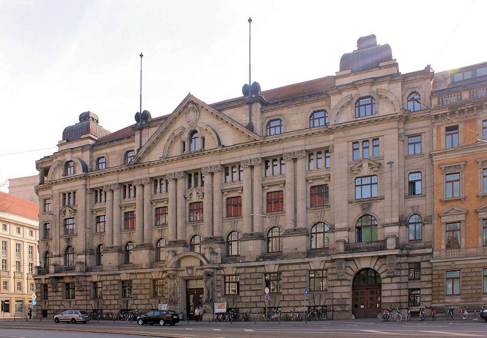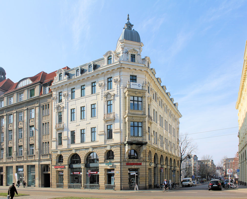 Letzte Station auf dem Rundgang durch das Zentrum-West ist Hochschule für Musik und Theater Felix Mendelssohn-Bartholdy Leipzig, Außenstelle Dittrichring [20]. Das 1908 von der Leipziger Lebensversicherung durch den Architekten Anton Käppler erbaute Gebäude folgt der prächtigen Bebauung des Leipziger Innenstadtrings um 1900. Der wuchtige Bau mit seiner Sandsteinfassade ist mit einer Kolossalordnung gegliedert. Zwei Atlasfiguren rahmen den Eingang. Hier endet der Rundgang durch das Zentrum-West in Leipzig.