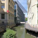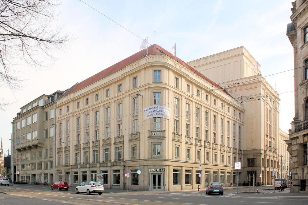 Durch die Gottschedstraße erreicht man den Dittrichring. An der Ecke steht das Weiße Haus, heute ein Hotel, und das Palais Schlobach [18]. Das Weiße Haus wurde 1920 als Messehaus gebaut. 2016 erfolgte der Umbau und des Weißen Hauses, dass auch eine neue Dachlandschaft bekam. Das anschließende Palais Schlobach wurde 1871 durch Arwed Roßbach errichtet. 2006 wurde das Gebäude abgerissen und 2014 bis 2016 die Fassade originalgetreu wieder aufgebaut. Vor dem Palais Schlobach endet der geöffnete Teil des Pleißemühlgrabens.Dem Dittrichring folgend kommt man zum Schauspielhaus Leipzig [19]. 1902 wurde am heutigen Dittrichring das private Centraltheater eröffnet. Im Dezember 1943 wurde das Centraltheater, wie alle städtischen Bühnen Leipzigs, zerstört. In dem notdürftig wieder hergestellten Theater fanden bis 1950 Aufführungen statt, dann wurde das Haus abgerissen. 1954 bis 1957 erfolgte der Neubau des Schauspielhauses.