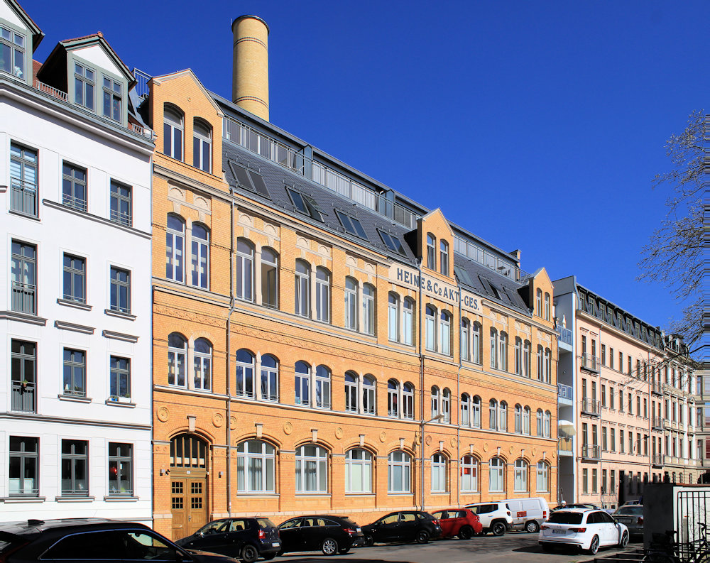 In der Schreberstraße fällt das Gebäude Nr. 6 mit seiner gelben Klinkerfassade auf [9]. An der Fassade ist noch die alte Inschrift zu lesen: Heine & Co Akt.-Ges. Das um 1900 gebaute Fabrikgebäude beherbergte einst eine Aromafabrik.