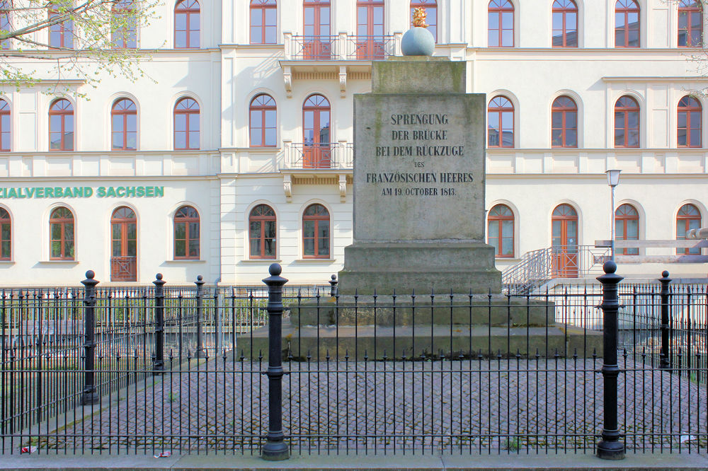 Der Rundgang durch das Zentrum-West beginnt am nordwestlichen Rand der Inneren Westvorstadt am Gebäude der Industrie- und Handelskammer zu Leipzig [1]. Das 1903 errichtete Bürogebäude weist eine für Leipzig typische Fassade im Reformstil auf. Daneben steht die Hauptfeuerwache. Das Gebäude wurde 1881 mit einer Fassade aus gelben Klinkern gebaut und erhielt 1928 eine neue Fassade im Stil der Neuen Sachlichkeit. Hinter den beiden Gebäuden befand sich bis zur Zerstörung im 2. Weltkrieg das Naundörfchen. Gelegen am Elstermühlgraben war das Naundörfchen ein Viertel für Handwerker und Arbeiter – ärmlich, jedoch idyllisch.Durch die Lessingstraße und die Thomasiusstraße führt der Rundgang zum Brückensprengungsdenkmal [2]. Das Denkmal erinnert an den Rückzug der französischen Armee nach der Völkerschlacht bei Leipzig am 19. Oktober 1813. Durch die zu frühe Sprengung der Brücke über den Elstermühlgraben war ca. 30.000 französischen Soldaten der Rückzugsweg abgeschnitten worden. Tausende von ihnen ertranken bei dem Versuch, das Gewässer schwimmend zu überwinden. Unter den Toten war auch der polnische General Józef Poniatowski, der noch zwei Tage zuvor zum Marschall ernannt worden war. 900 Munitionswagen und 300 Kanonen fielen in die Hände der Verbündeten Truppen. Tausende Soldaten, die für Napoleon gekämpft hatten, gerieten in Gefangenschaft. Hier, an der Kreuzung des Rannstädter Steinwegs und der Leibnizstraße stand das Äußere Rannische Tor an der Via Regia.