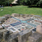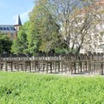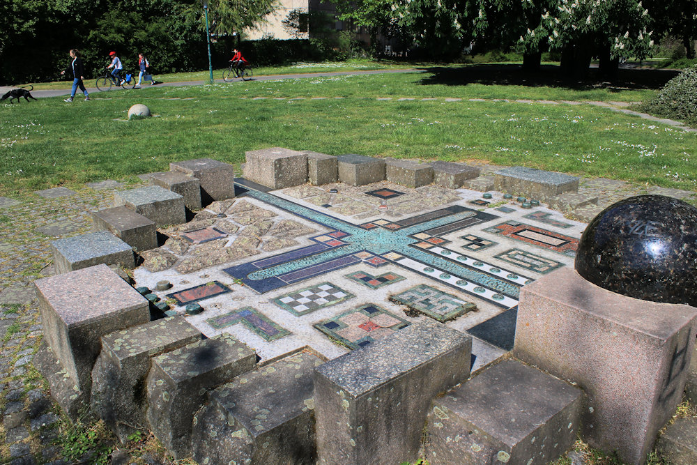 Die Friedrich-Ebert-Straße überquerend ist man wieder in der Inneren Westvorstadt und kommt auf eine Grünfläche [13]. Auf der rechten Seite befindet sich ein reliefartiges Denkmal, das an die barocke Gartentradition der Westvorstadt erinnert. Die Grünfläche entstand erst nach dem 2. Weltkrieg. Hier stand die Kath. Propsteikirche St. Trinitatis. Die Alte Trinitatiskirche war der erste katholische Kirchenneubau in Leipzig nach der Reformation. 1847 wurde die Kirche geweiht und 1943 durch einen Bombenangriff zerstört. Die bereits erteilte Genehmigung zum Wiederaufbau wurde kurzerhand zurückgezogen, das Baumaterial beschlagnahmt und die Kirchenruine abgerissen. Unweit des alten Standorts wurde 2015 wurde die neue Propsteikirche St. Trinitatis geweiht.