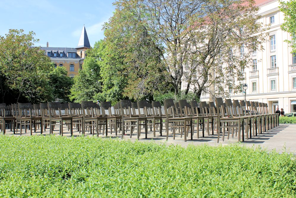 Durch die Bosestraße erreicht man die Gottschedstraße. Hier steht das Denkmal für die Große Gemeindesynagoge von Leipzig [17]. Die Große Gemeindesynagoge war der älteste und bedeutendste Synagogenbau in Leipzig. Sie wurde 1854 bis 1855 nach Plänen des Semperschülers Otto Simonson auf einem drachenförmigen Viereck erbaut. Während der Progromnacht am 9. November 1938 wurde sie in Brand gesteckt und zerstört. Die Gemeinde musste die Ruine auf eigene Kosten abreißen. Heute erinnert ein beeindruckendes Denkmal mit leeren Stühlen an die jüdische Gemeinde in Leipzig.