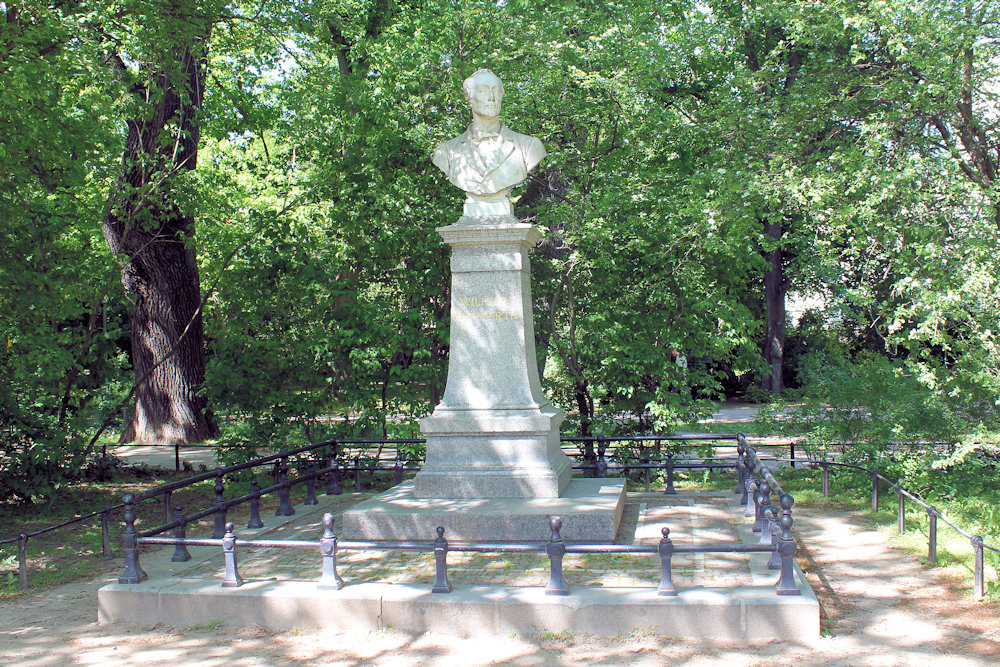 Durch die Schreberstraße erreicht man den Johannapark und die Lutherkirche [10]. 1883 bis 1886 wurde das Gotteshaus durch den Architekten Julius Zeißig aus gelben Klinkern errichtet. Die Ev. Lutherkirche in Leipzig ist ein Zentralbau auf griechischem Kreuz. Am Chor der Lutherkirche befindet sich das Grabmal der Familie Seyfferth. Wilhelm Seyfferth stiftete den Johannapark, durch den Rundgang nun führt.Den Johannapark [11] ließ 1858 bis 1863 der Leipziger Unternehmer und Bankier Wilhelm Theodor Seyfferth auf seine Kosten anlegen und übertrug ihn der Stadt Leipzig. Seyfferth wollte mit dem Park an seine im Alter von 21 Jahren verstorbene Tochter Johanna Natalie Schulz erinnern. Der Legende nach starb sie an gebrochenem Herzen, weil sie, dem Wunsch des Vaters folgend, Dr. Gustav Schulz heiraten musste, obwohl sie in einen anderen Mann verliebt war. Im Johannapark befindet sich auch ein Denkmal für den Stifter Wilhelm Seyfferth.