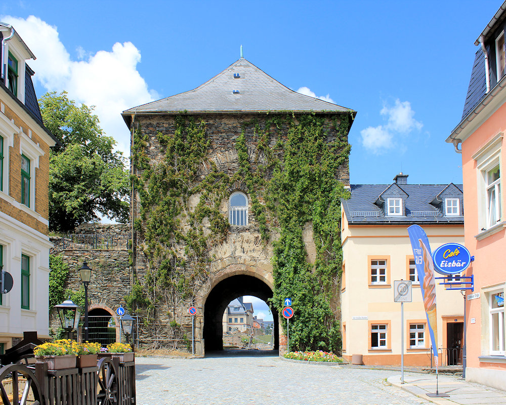 Teile der Stadtbefestigung mit dem Zschopauer Tor sind am nördlichen Rand der Altstadt von Marienberg erhalten.