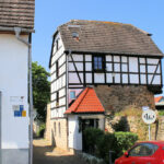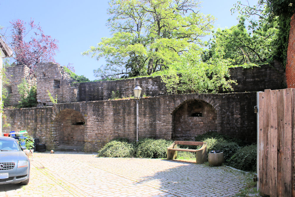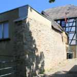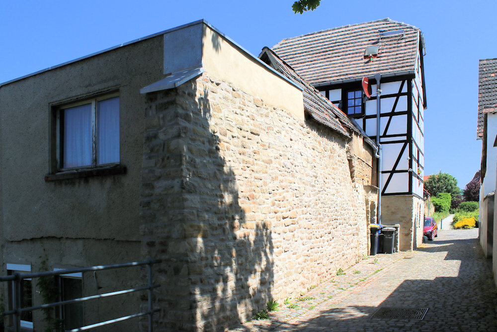 - Sandstein, ein Turm später mit Wohnhaus mit Sichtfachwerk überbaut, andere Türme tlw. verputzt