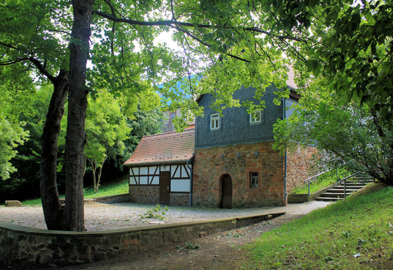 Nebengebäude: Sichtfachwerk auf hohem Bruchsteinsockel