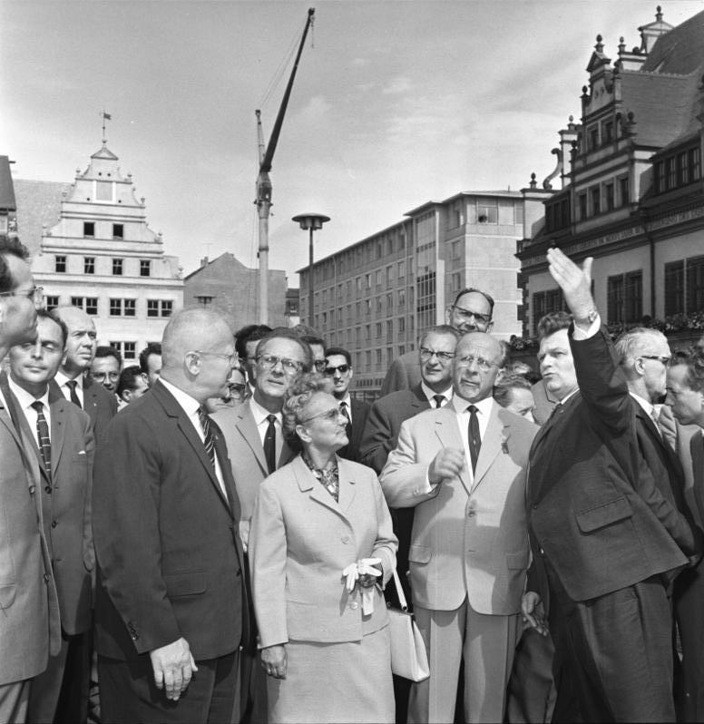 Walter Kresse (links) neben Erich Honecker, Lotte und Walter Ulbricht zur Leipziger Herbstmesse 1964