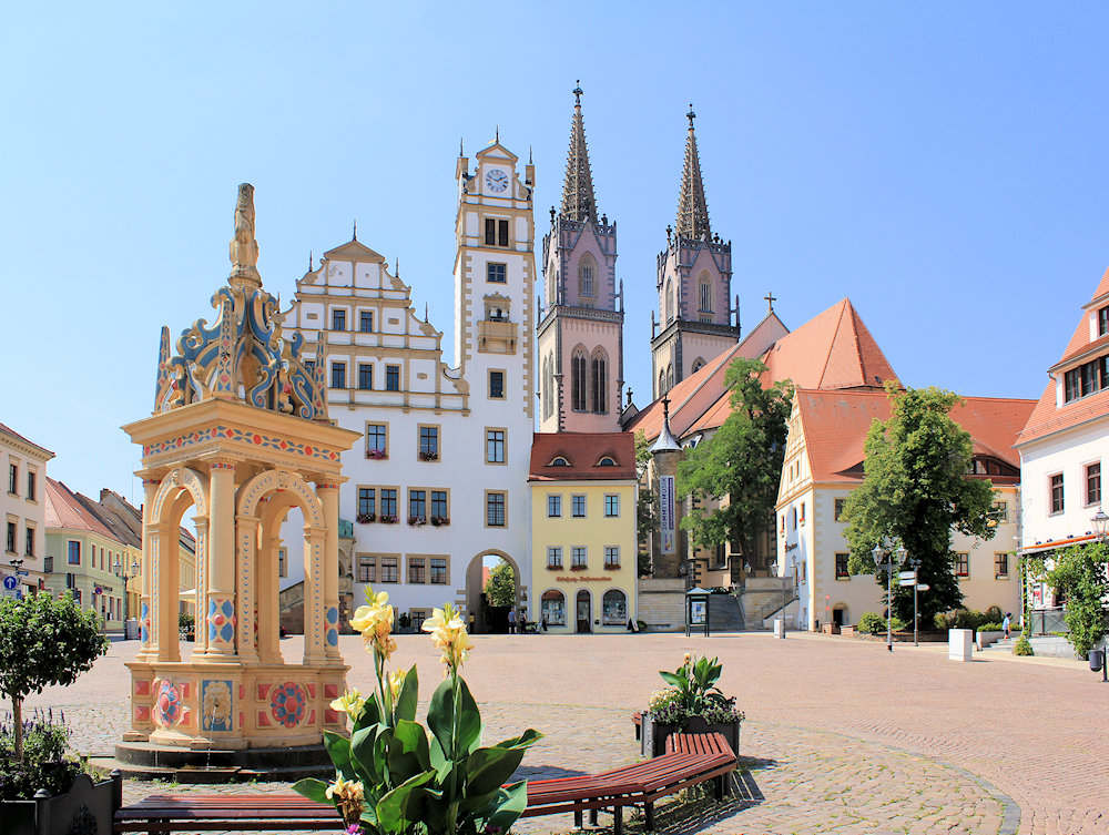 Neumarkt mit Rathaus und Stadtkirche in Oschatz