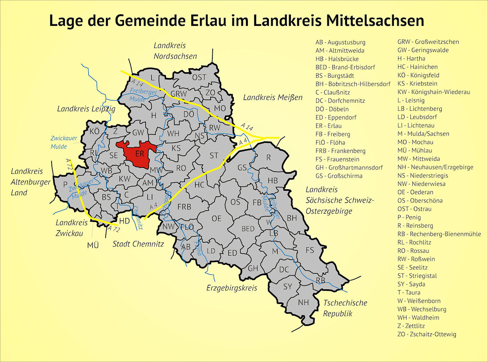 Die Gemeinde Erlau liegt am Fluss Zschopau. In der Gemeinde Erlau leben ca. 3.300 Menschen (Stand 31.12.2015).