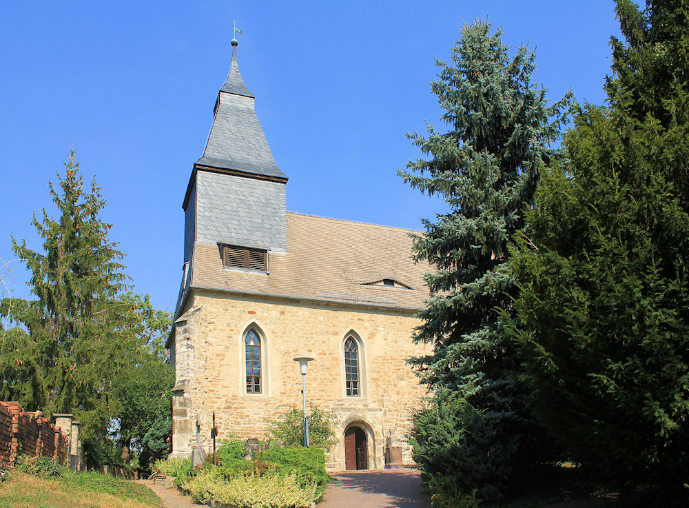 Bei herrlichstem Spätsommerwetter begann meine Rundtour zu Kirchen im westlichen Saalekreis in Kötzschau. Die romanische Kirche in Kötzschau aus dem späten 12. Jahrhundert wurde in der Spätgotik umgebaut. Der eingezogene, dreiseitig geschlossene Chor mit Maßwerkfenstern und das profilierte Stufenportal sind besonders sehenswert. Ich war allein in der Kötzschauer Kirche, keine Besucher, niemand, der mir zur Kirche etwas erzählen konnte. So radelte ich weiter nach Schladebach. In der romanischen Kirche probten einige Musiker und das Portal war mit einer Girlande geschmückt – vielleicht eine bevorstehende Feier? Ansonsten keine Besucher und keine Führung.