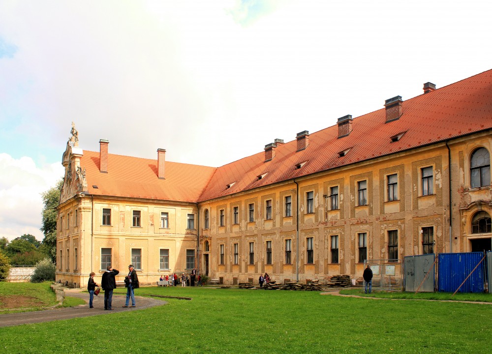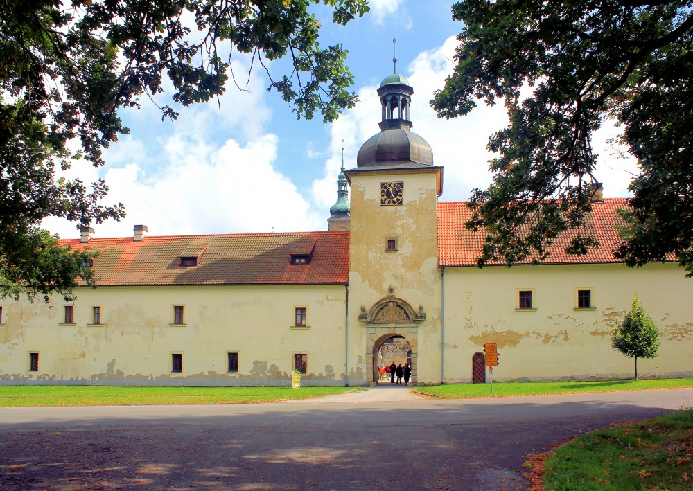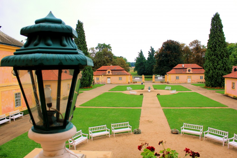 An das dreiflügelige Schloss schließen sich niedrigere Wirtschaftsgebäude an, die zusammen mit dem Tor einen Ehrenhof umschließen. Ende des 18. Jahrhunderts ließ Johann Rudolf Graf Czernin von Chudenitz die Schlosskapelle erweitern, zwei neue Treppenhäuser anbauen und das ursprüngliche Gehege zu einem englischen Park mit anmutigen Zierbauten umwandeln.