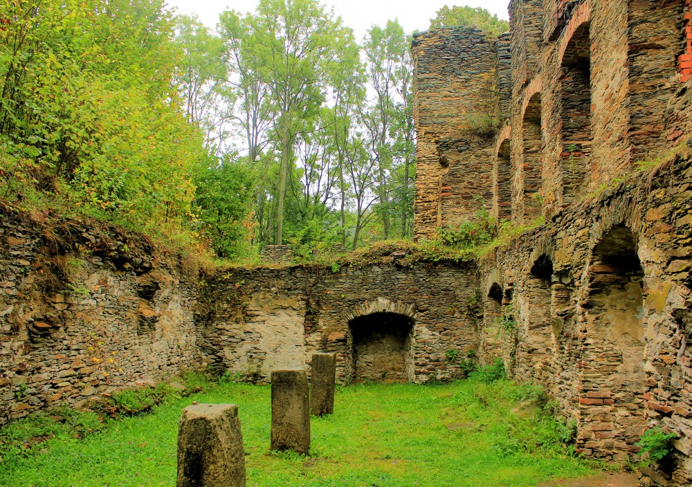Die Burg ist eine Kombination aus Höhen- und Wasserburg. Sie steht auf einem Felsen, der aus dem Tal des Soosbaches (Sázek) ragt. Der Bach wurde früher angestaut, so dass die Kernburg von Wasser umgeben war. Die ältesten Bauteile der Burg sind das Portal zur Vorburg und ein Teil der Ringmauer. Der das Tor zur Kernburg flankierende Bergfried und die zwei Geschosse umfassende Kapelle stammen aus der Zeit der Romanik.